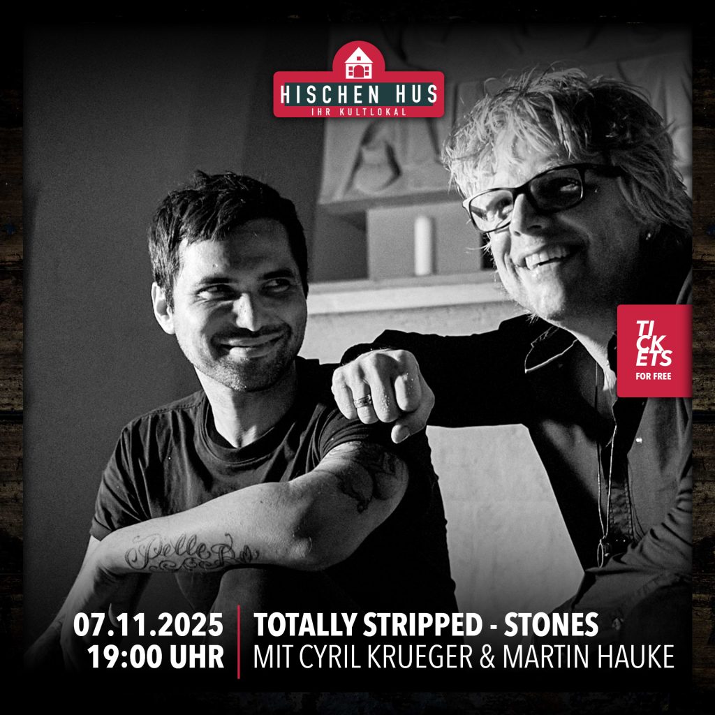 Zwei Gitarren, zwei Generationen, eine große Liebe: die Rolling Stones. Cyril Krueger (The Jetlags, Dickes C) und Martin Hauke (Learning to Fly, Elizabeth Lee) bringen mit ihrem Herzensprojekt „Totally Stripped“ die Magie der Stones in akustischer Form auf die Bühne. In intimer Atmosphäre interpretieren sie Klassiker wie „Angie“ oder „Jumpin’ Jack Flash“ neu und erzählen dabei unterhaltsame Anekdoten rund um die legendäre Band. Ein Abend voller Musik, Geschichten und echter Bar-Vibes – nah dran, ehrlich und unvergesslich.